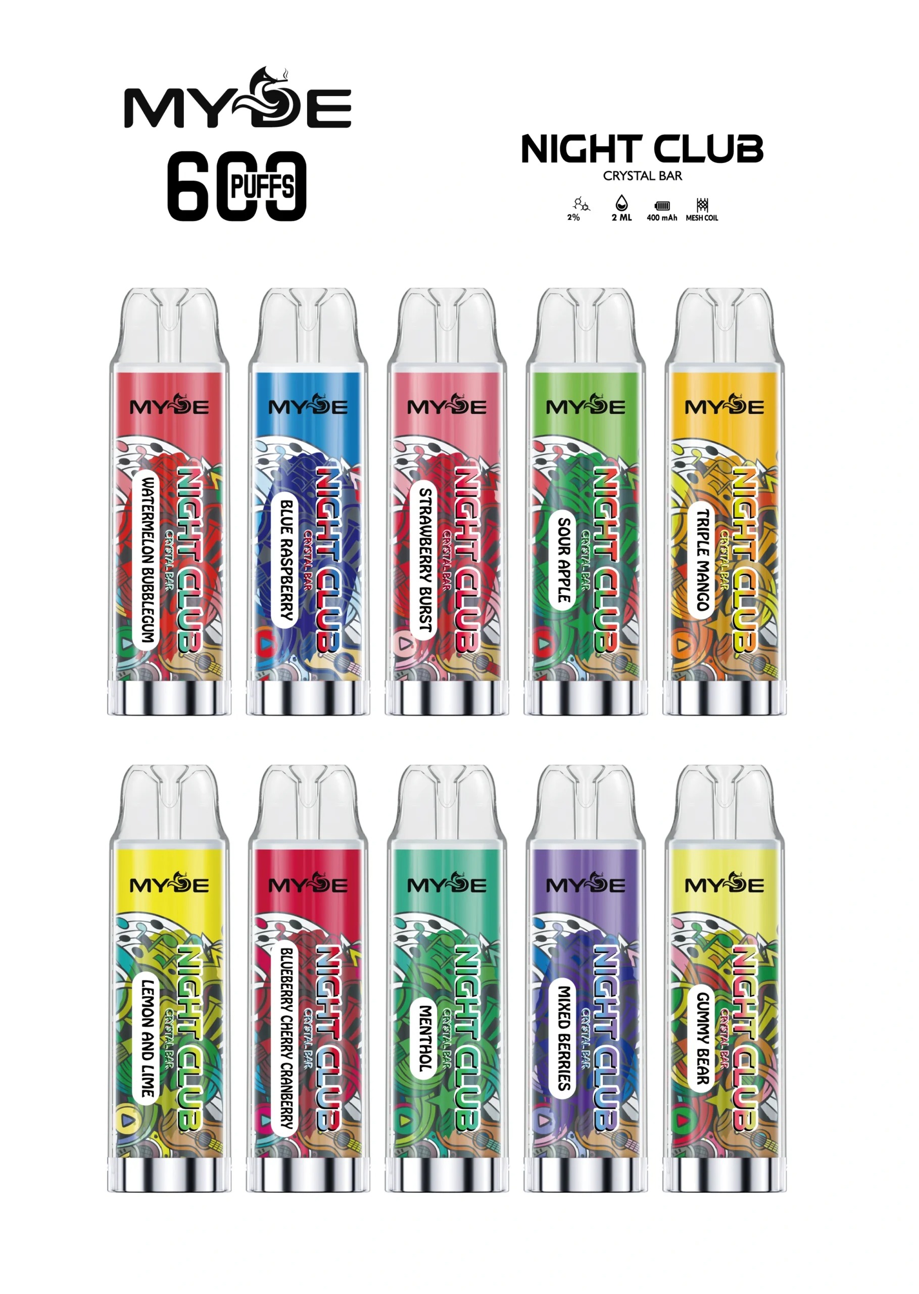 La serie de clubes nocturnos MYDE cuenta con una amplia cartera de 22 mezclas aromáticas meticulosamente diseñadas. Cada formulación se elabora utilizando esencias botánicas de grado alimenticio premium para garantizar una experiencia sensorial altamente estable y satisfactoria durante toda la vida útil del dispositivo. Nuestra diversa selección se adapta a un amplio espectro de preferencias de los consumidores: